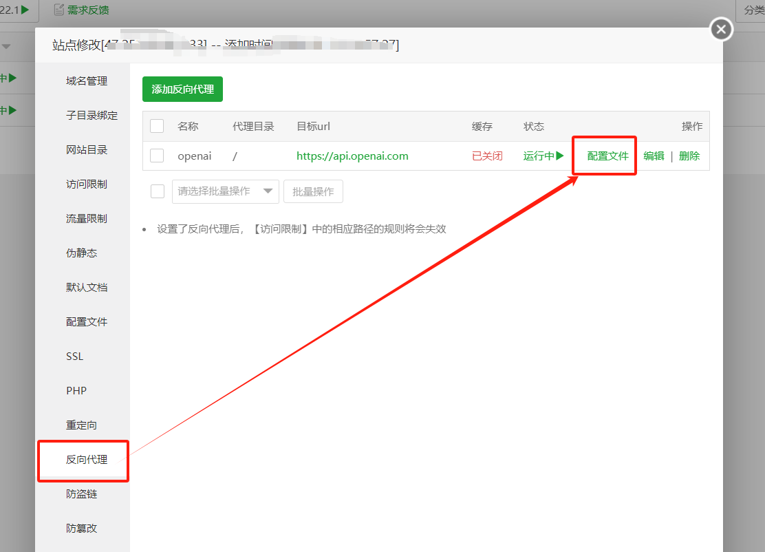 打开海外宝塔面板 -> 站点设置 -> 反向代理 -> 配置文件